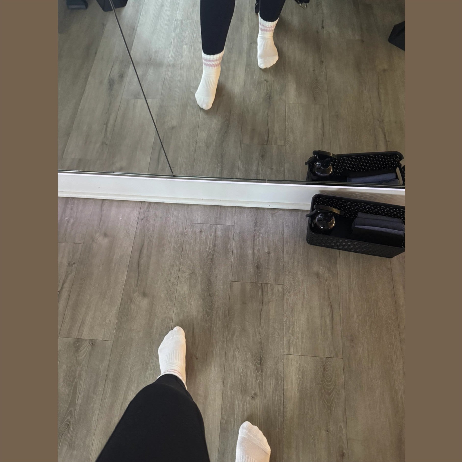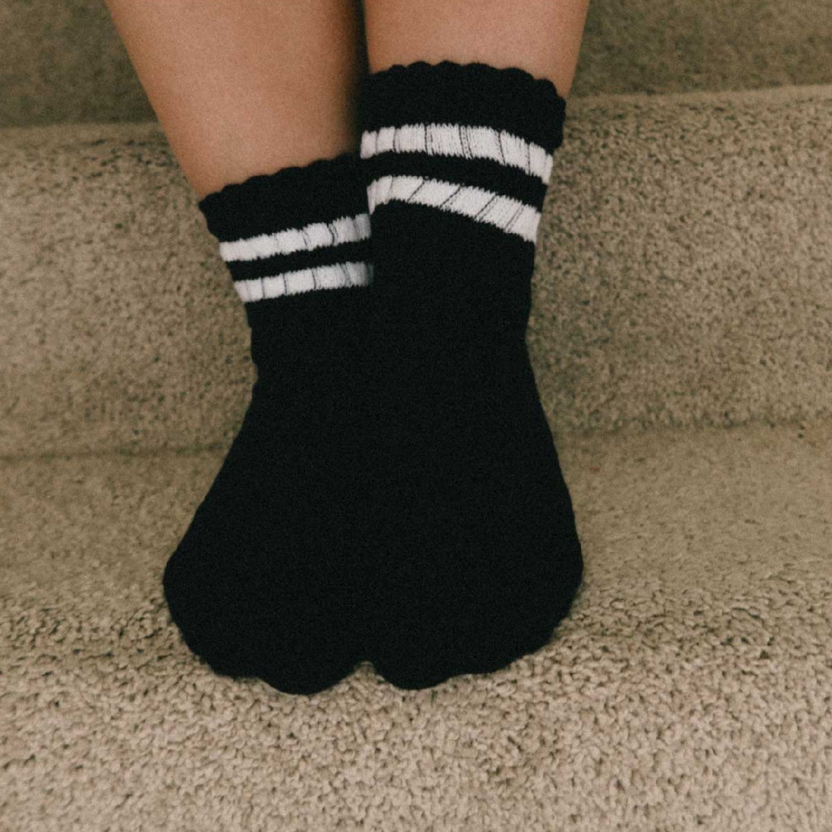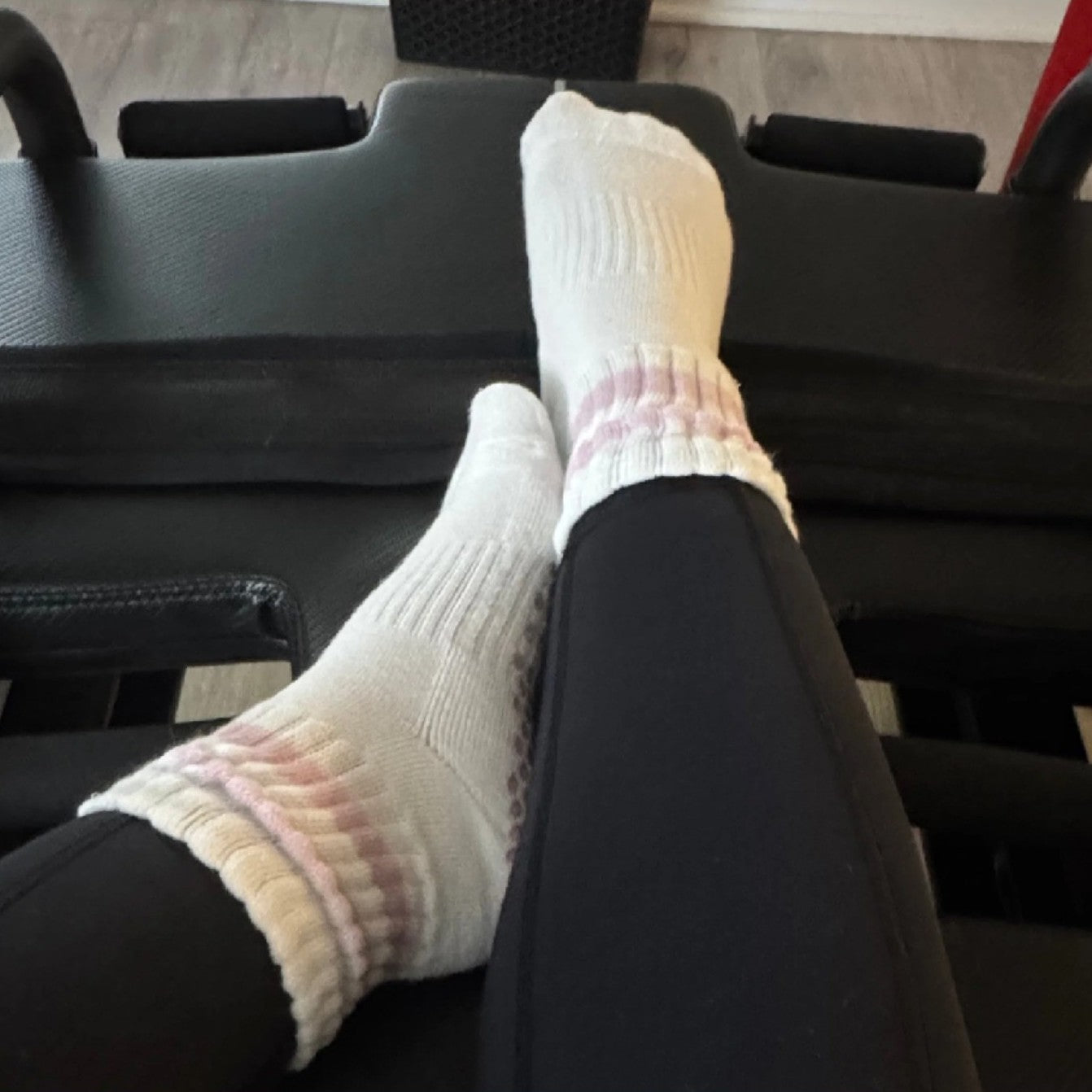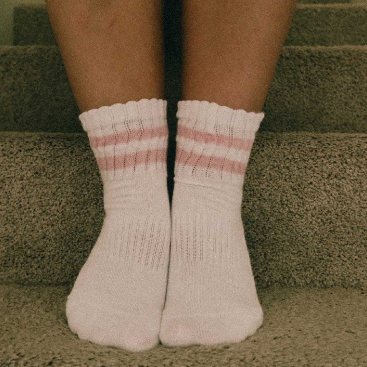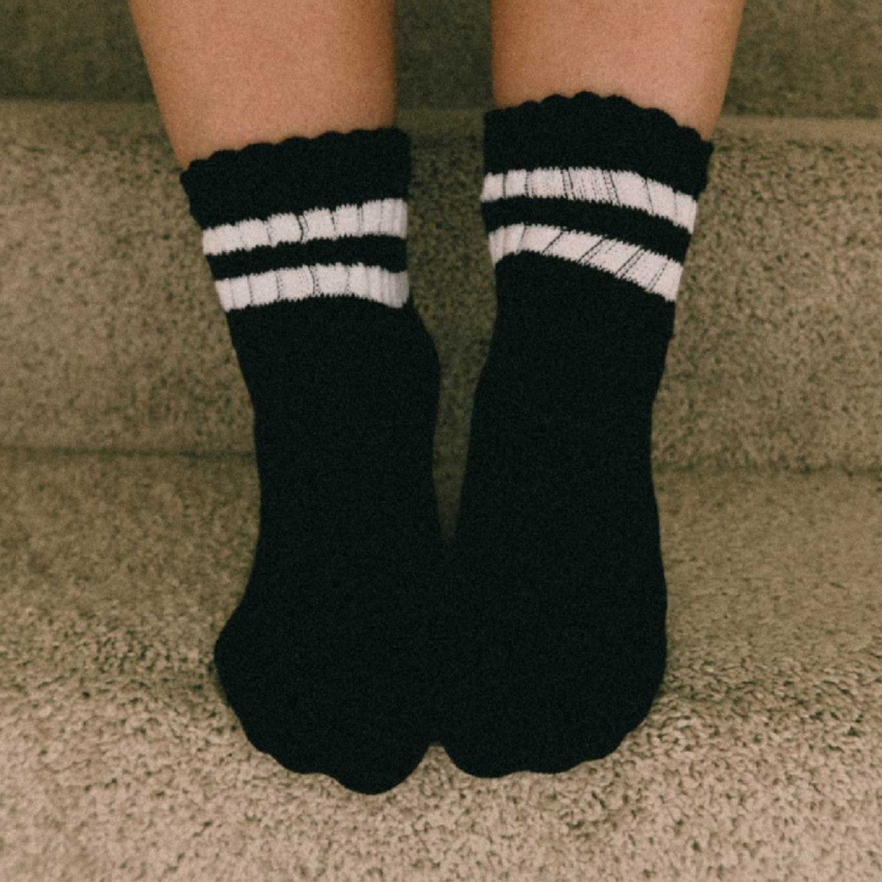 The Mini Scrunch Grip Socks in White and Baby Pink Stripes and Black and White Stripes offer the perfect mix of playful style and everyday performance. Featuring a cute mini scrunch silhouette, they add a relaxed, effortless look while while staying snug and secure on your feet. The contrasting stripe designs let you switch between soft, feminine charm or timeless monochrome chic. Finished with premium nonslip grips, they keep you steady during Pilates, yoga, barre, or lounging at home. Soft, breathable, and endlessly wearable, these socks bring comfort, grip, and personality to every step.