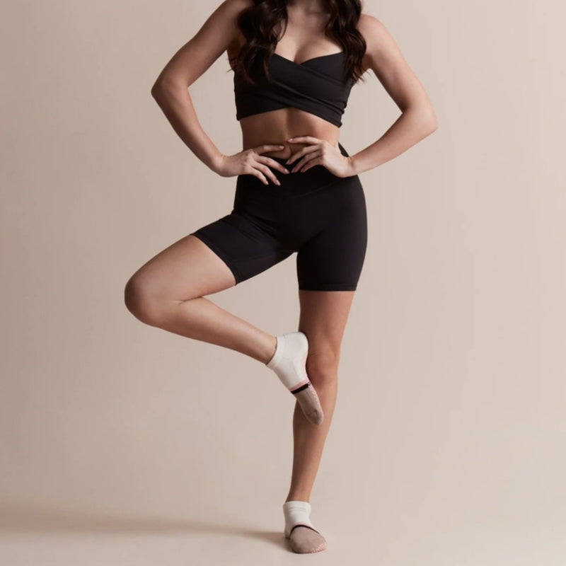 A classic grip sock from Club Martyn. Crafted from a super soft and breathable cotton fabric, the Classic Ankle Grip Socks are the perfect pair of socks for Pilates, Yoga and Barre. This style hits at the ankles for a comfortable full coverage style. The signature "Join the Club" grip provides support and hold, eliminating any sliding during class. Now in a gorgeous toffee, pink and chocolate or espresso color block style!