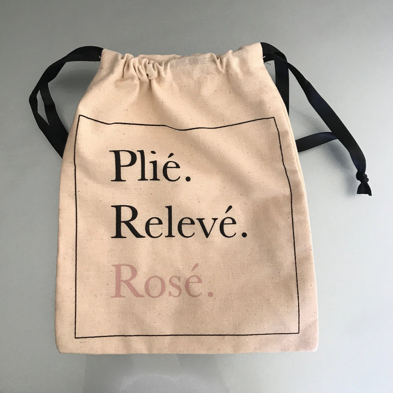 The natural order of things when all things are right in the world. Plie Releve Rose.  You'll want to stash your favorite socks in one of our signature Grip Sock Bags.  Made to easily fit 2-3 pairs of grip socks.  Black ribbon draw strings and double lined cotton fabric.