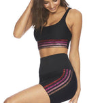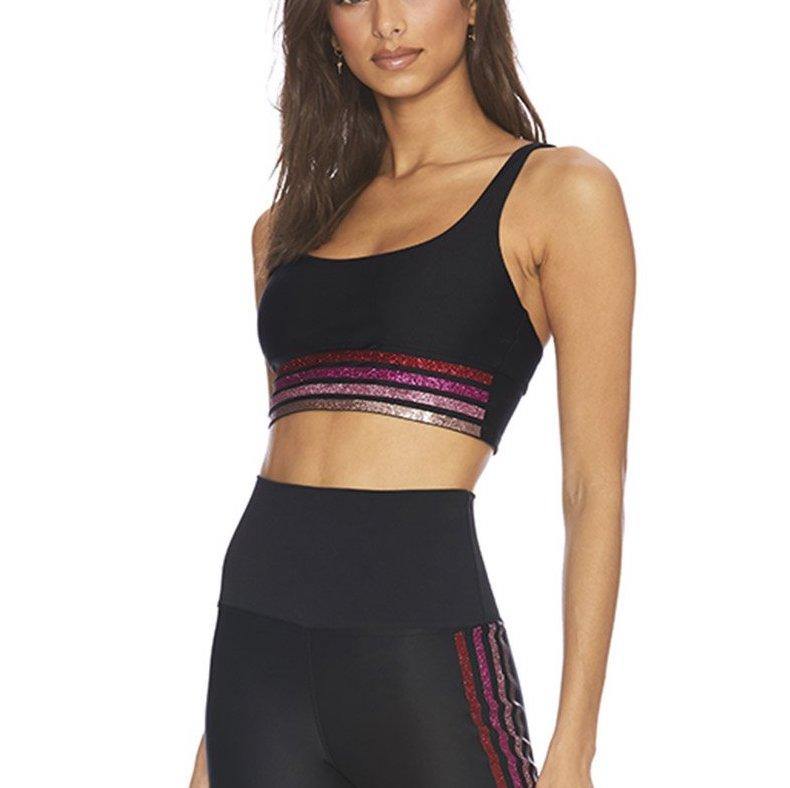 Beach Riot's Leah Top is their go-to tank sports top in black. This version features shimmery pink, red, and rose gold stripes along with the band beneath the bust which will make you stand out during your workouts. Make it a set and pair it with the Jade Legging.