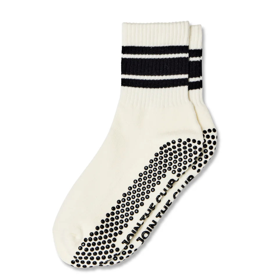 Old School is now new school! The Retro Crew Grip Socks from Club Martyn are the perfect pair of socks to add elevated style to your workout look. Featuring a retro sport stripe and a ribbed cuff, these socks will stay in place whilst you stretch and move during class. Made from a breathable cotton fabric, and featuring their signature "Join the Club" grip, these socks are the perfect blend of sporty chic and will help eliminate any slipping or sliding during your workout.