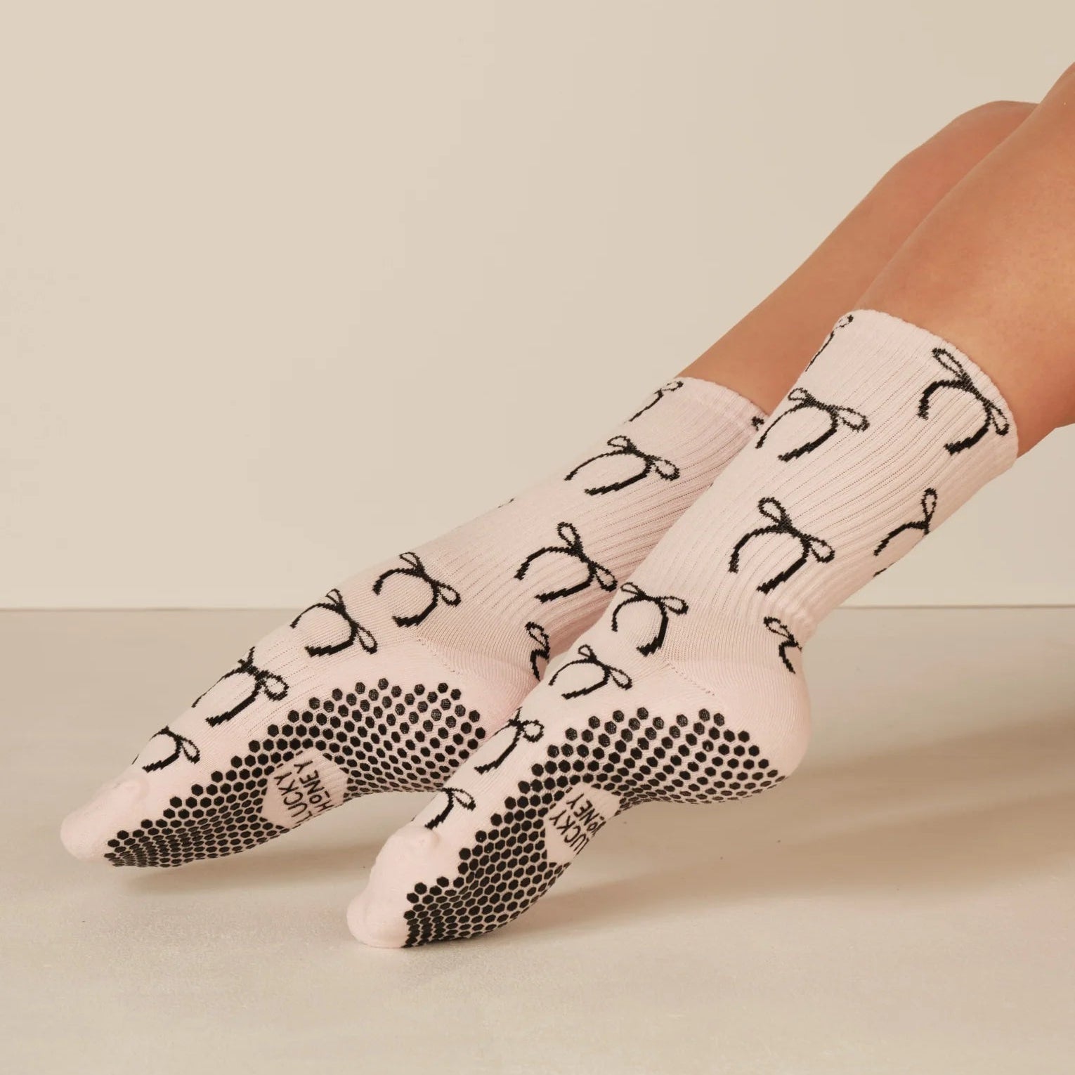 It's all tied up with a pretty little bow. Meet the Ballet Bows Tall Tube Grip Sock. The favorite crew style with an updated twist...a bow print These socks are perfect studio to street style. Featuring the brand's signature hexagonal silicon grip from toe to heel.  More protection + stability than the traditional grip sock. Now in a baby pink hue with black bow print.