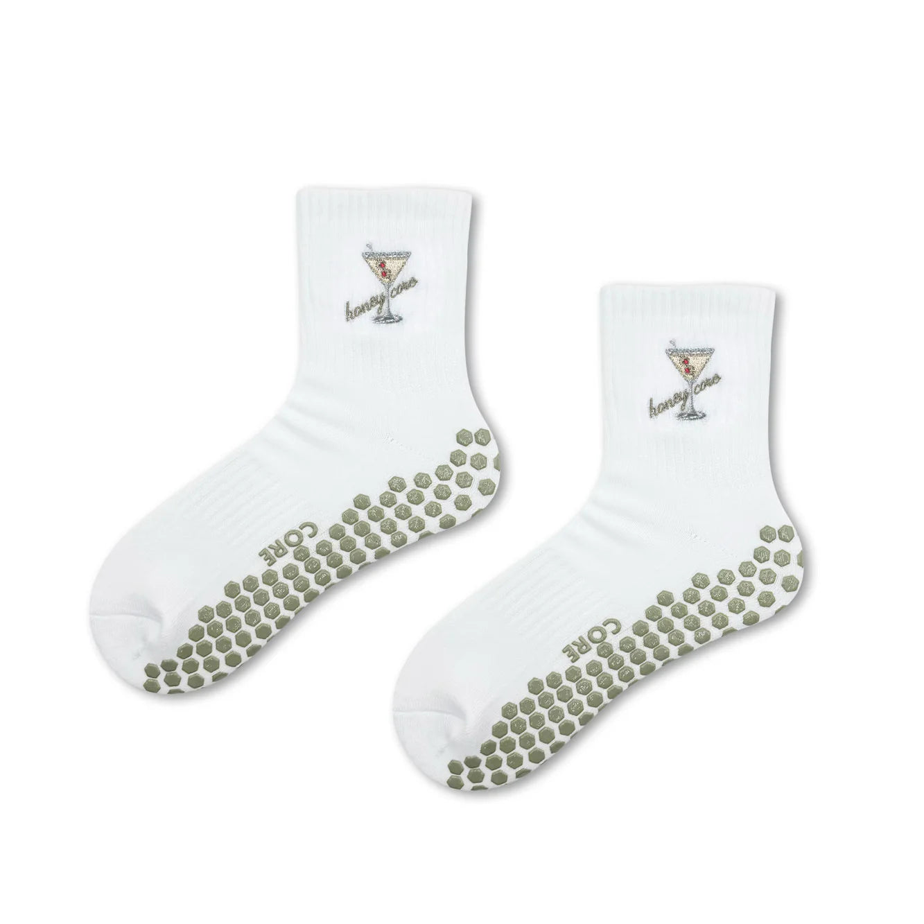 A classic crew style grip sock with an adorable martini design from HONEY CORE. A simple design, in a solid logo style. Lightweight feel with compression arch for optimal support! Now in white with embroidered martini glass with olive.