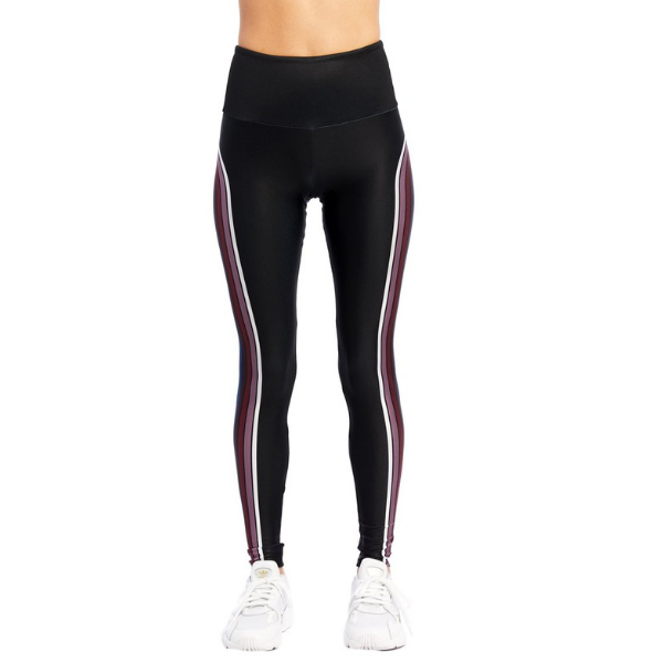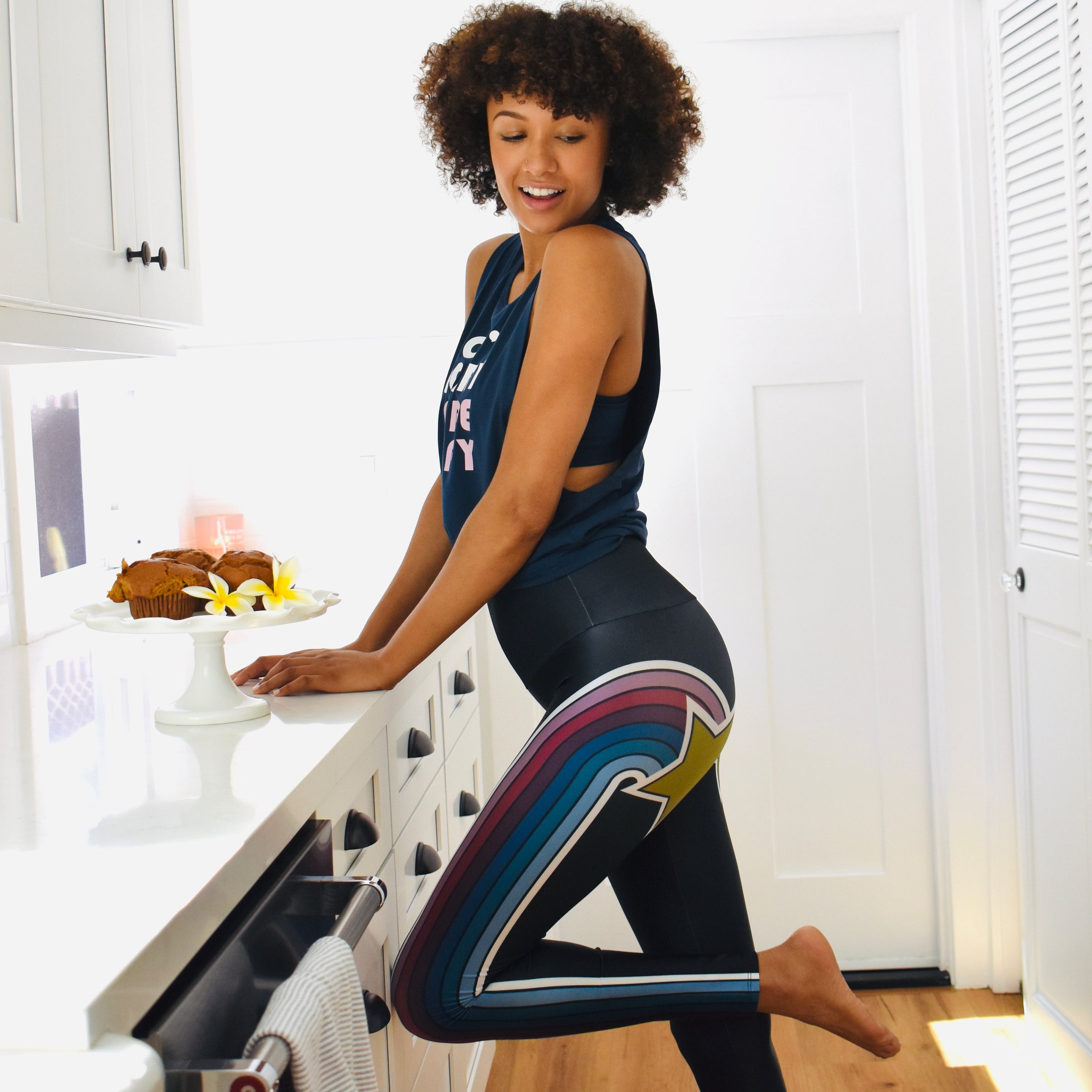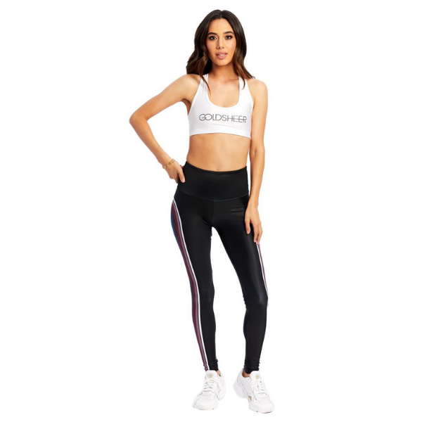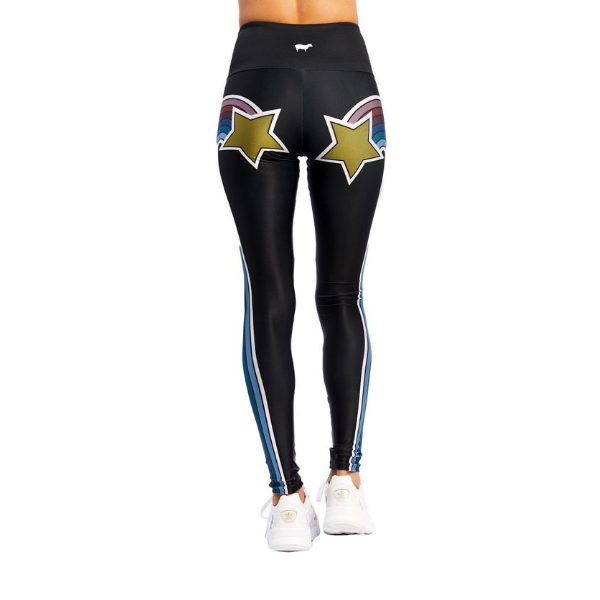 Part Rainbow Bright part 80's rock star.  New and improved leggings by Goldsheep Clothing. Featuring their new fabrication for more sustainable wear through all of your workouts, The Goldsheep Shooting Star legging will be the perfect compliment to your workout wardrobe.  A solid black background is accented with their signature double rainbow style with metallic hearts to accent your bottom.  Goldsheep is known for their comfortable fitting garments and their one of a kind prints.