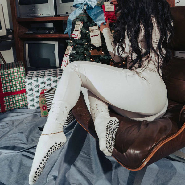 Let it shine! A classic throw back style with a festive twist. We love these long, crew style grippy socks by Pilates Honey that can be scrunched down for a nod to the 80s.  Pair with your favorite pair of leggings to take your barre, yoga or pilates practice to the next level. Now in a cream color with pearl and rhinestone accents!