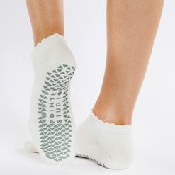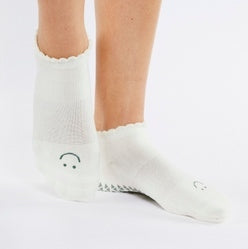Good vibes only. A two-toned, smiley face design on classic grip sock look. Cushioned bottoms for a secure and comfortable stance during barre, pilates or yoga. Now in a classic off white color with adorable happy face.