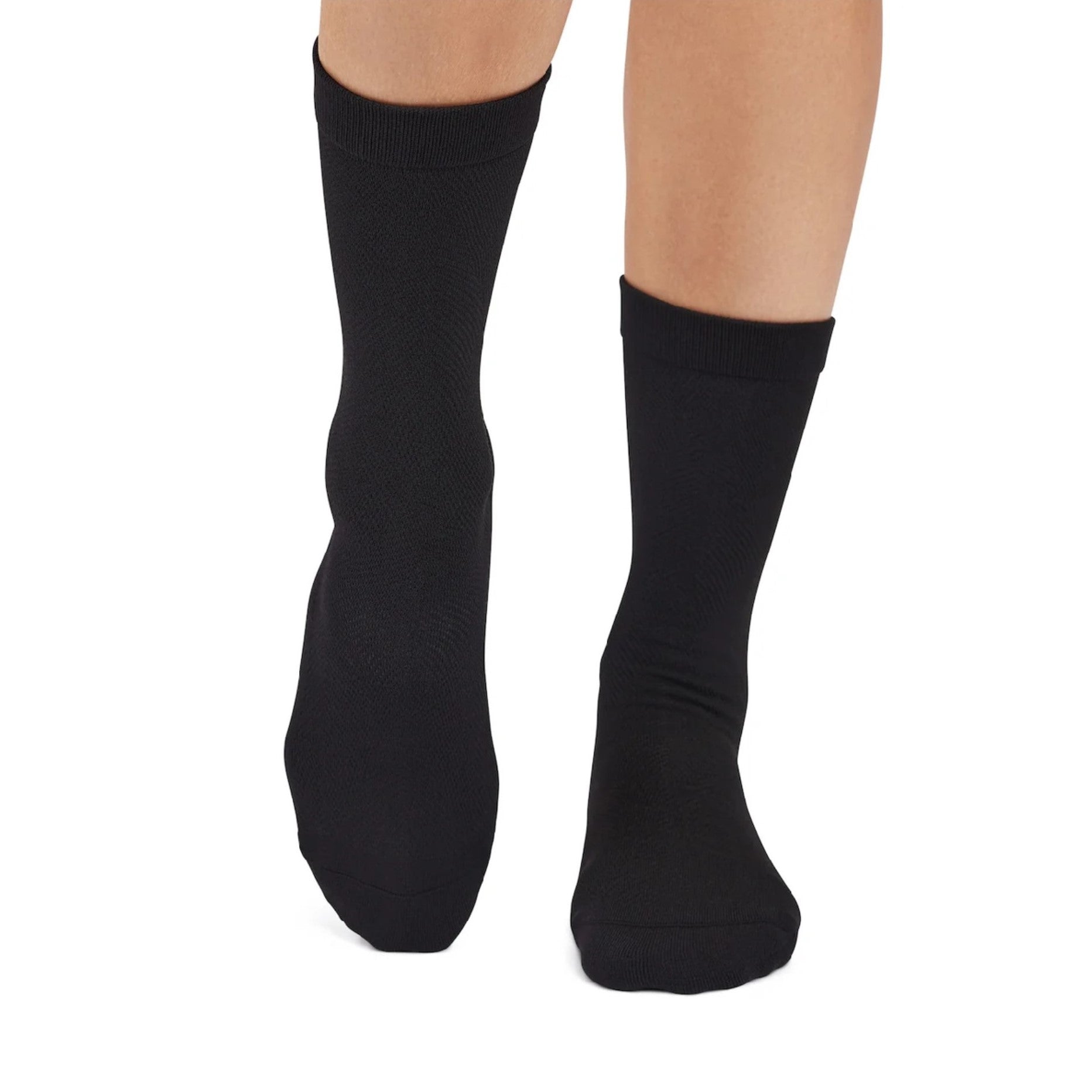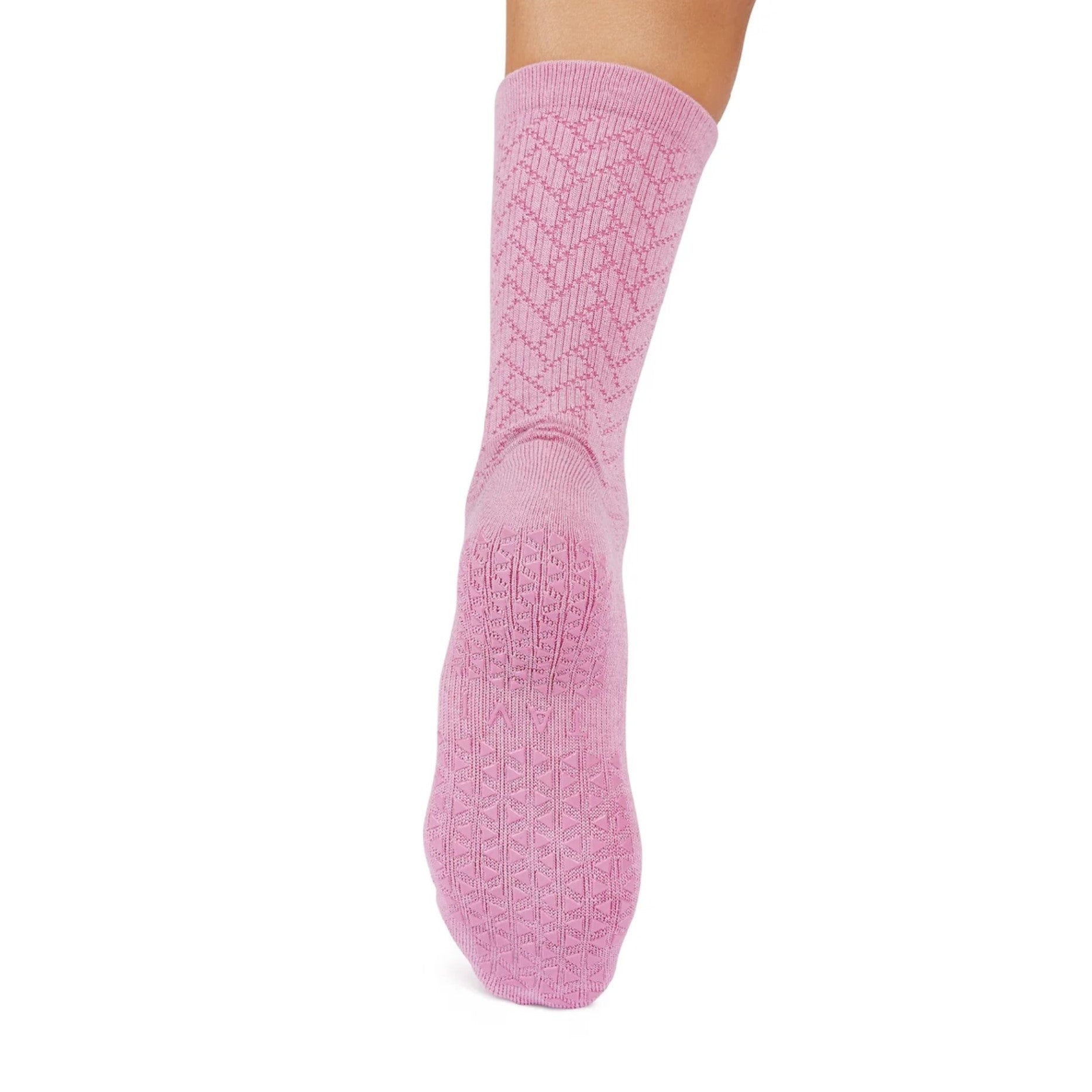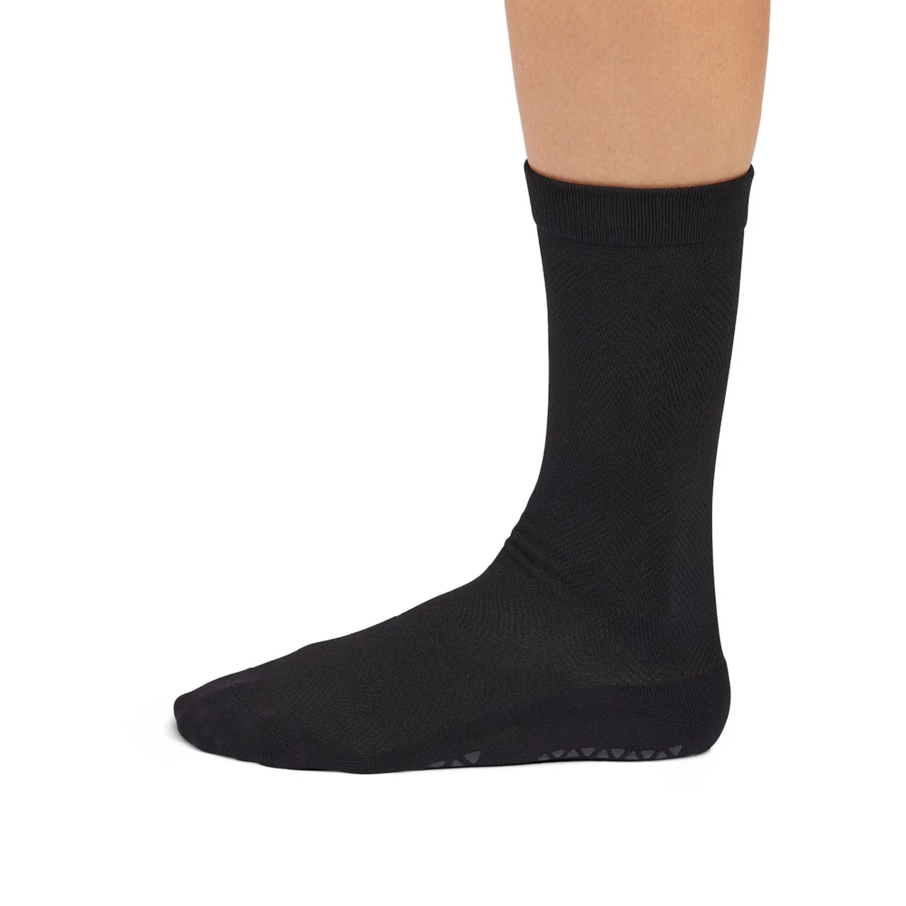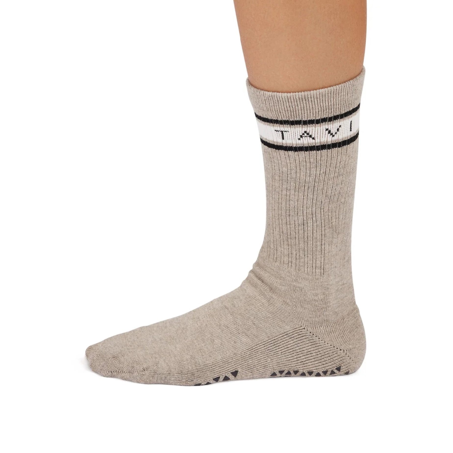 A classic crew style sock that won't go out of style. Tavi Active's stellar grip sock pattern safely moves you through your barre, Pilates, and yoga classes by giving your feet a strong grip to the floor while giving you that nearly barefoot feel. The Kai is made to hit mid calf and features sporty stripes for an athletic vibe. Now in an array of colors and patterns.