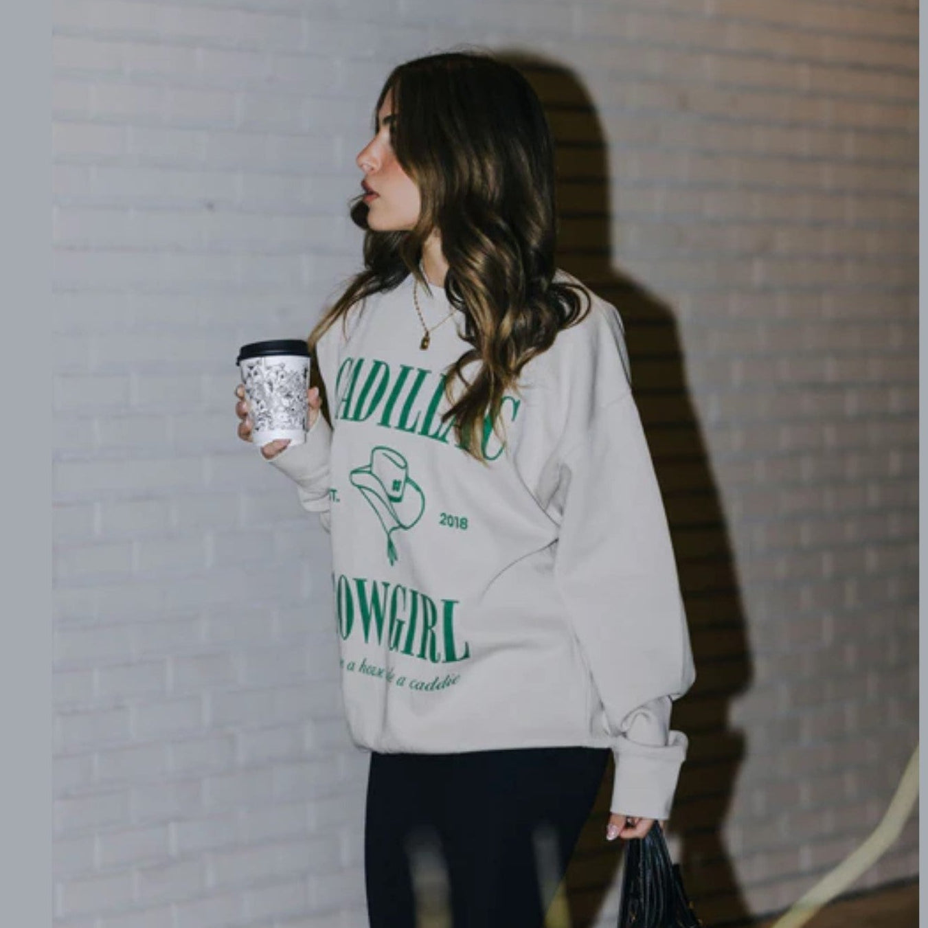 Save a horse, ride a caddie! An oversized sweatshirt that is the ultimate blend of comfort and style, featuring a relaxed fit that gives off an effortlessly cool vibe. Crafted from soft, breathable fabric, it's perfect for all-day wear, whether you're lounging at home or out and about. The neutral color with green "Cadillac Cowgirl" print adds the perfect pop of color. With its  chic and laid-back look, this sweatshirt is a must-have staple for any casual, yet stylish, outfit.
