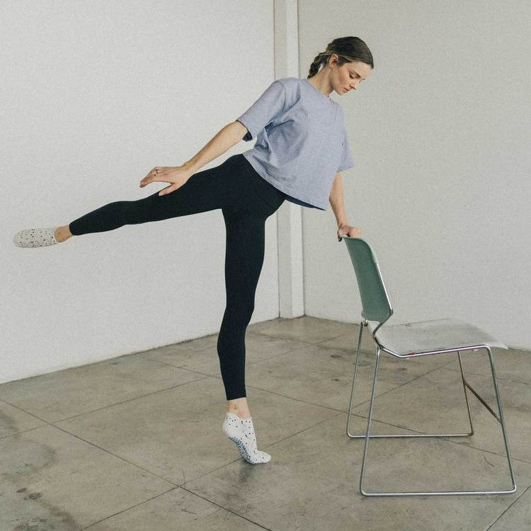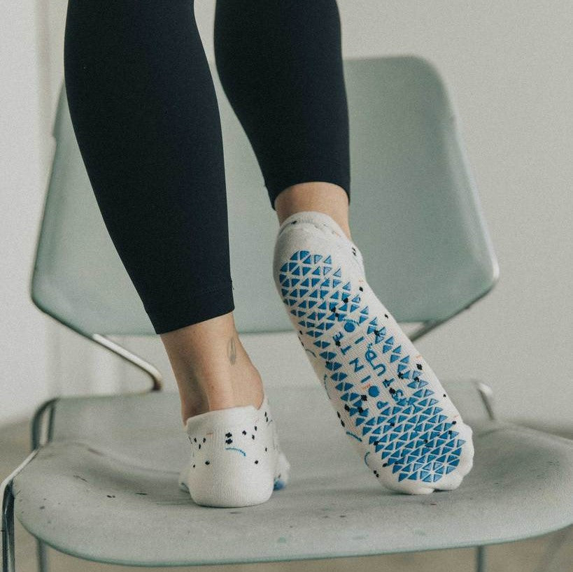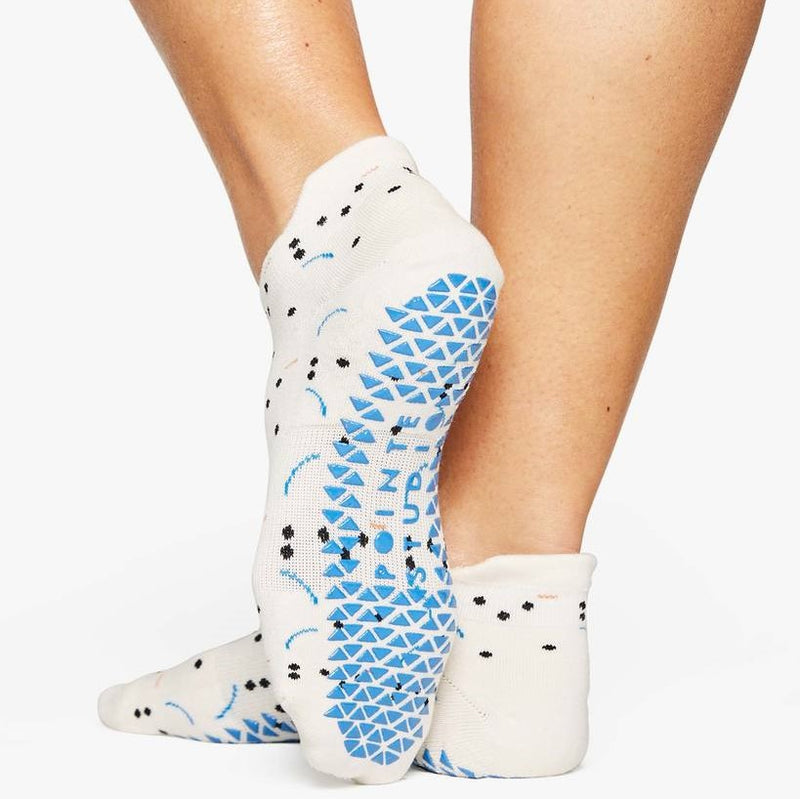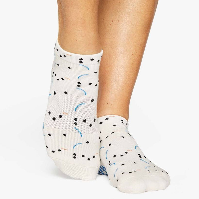 Pointe Studio's best-selling original cushioned grip sock now in a whimsical polkadot splatter print! The ankle grazing style is the perfect accessory for your floor or mat based workouts!