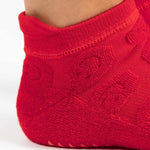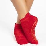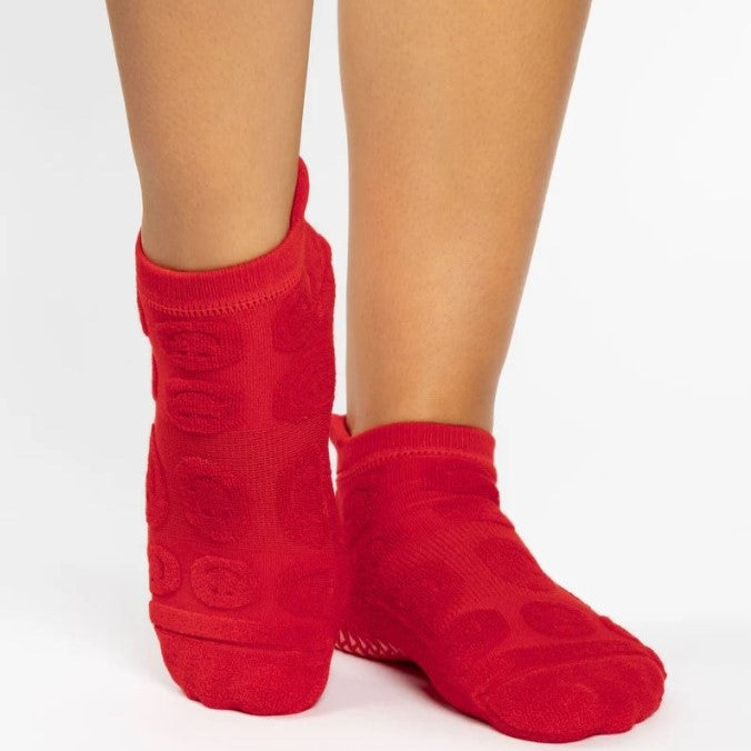 Good vibes only. A cheerful, smiley face design on classic grip sock look. Cushioned bottoms for a secure and comfortable stance during barre, pilates or yoga. Now in fun red and ivory plush terry styles!