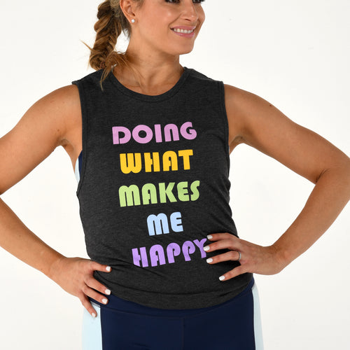 Don't Worry Barre Happy - Pink Foil - Navy Muscle Tank