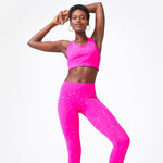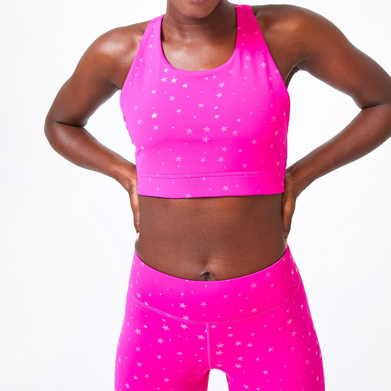 A good day starts with pink. At least we think so. Shine all year long in this pink sports bra stamped with tiny, shimmery foil stars. Pair this racerback bra with the matching legging for an unmissable active set that's all good vibes!