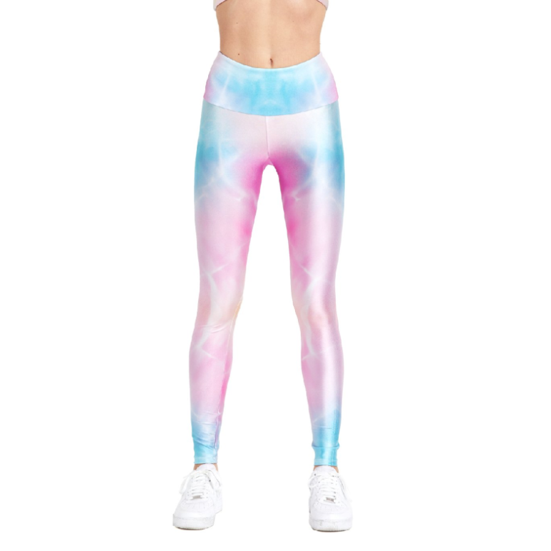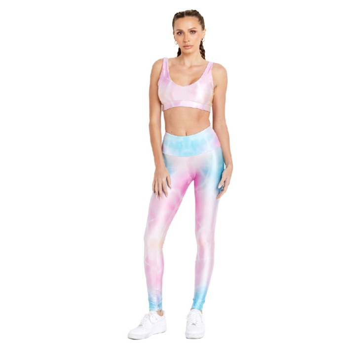 A feel good pastel piece that will be sure to help you stand out.  These watercolor-inspired tie dye leggings by GOLDSHEEP feature a lively take on a classic, feel good print.  Goldsheep knows how to design vibrant, unforgettable prints, and this one is no different!   Fabric has a slight sheen with a luxe feel.  Waistband is mid-rise for just the right amount of support.