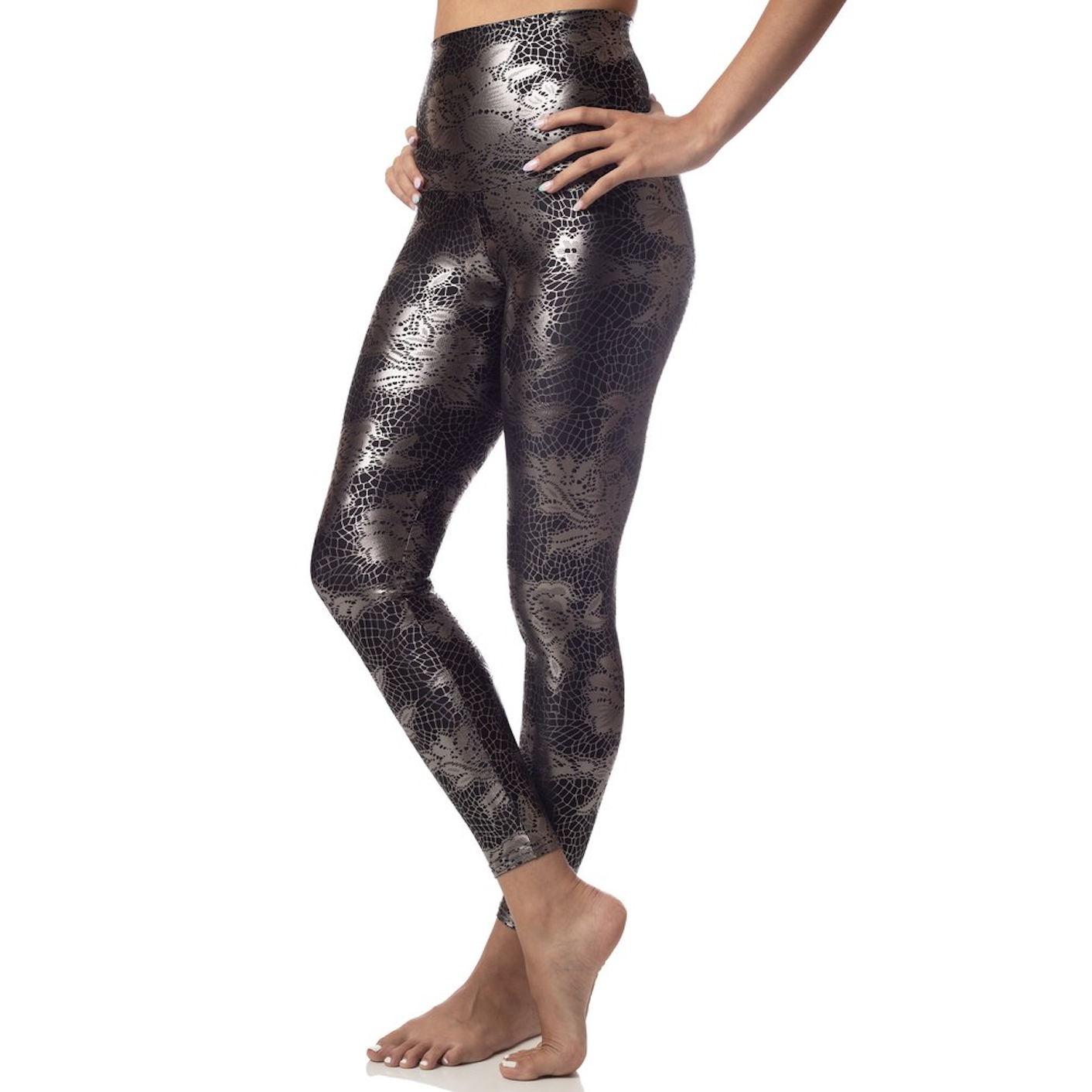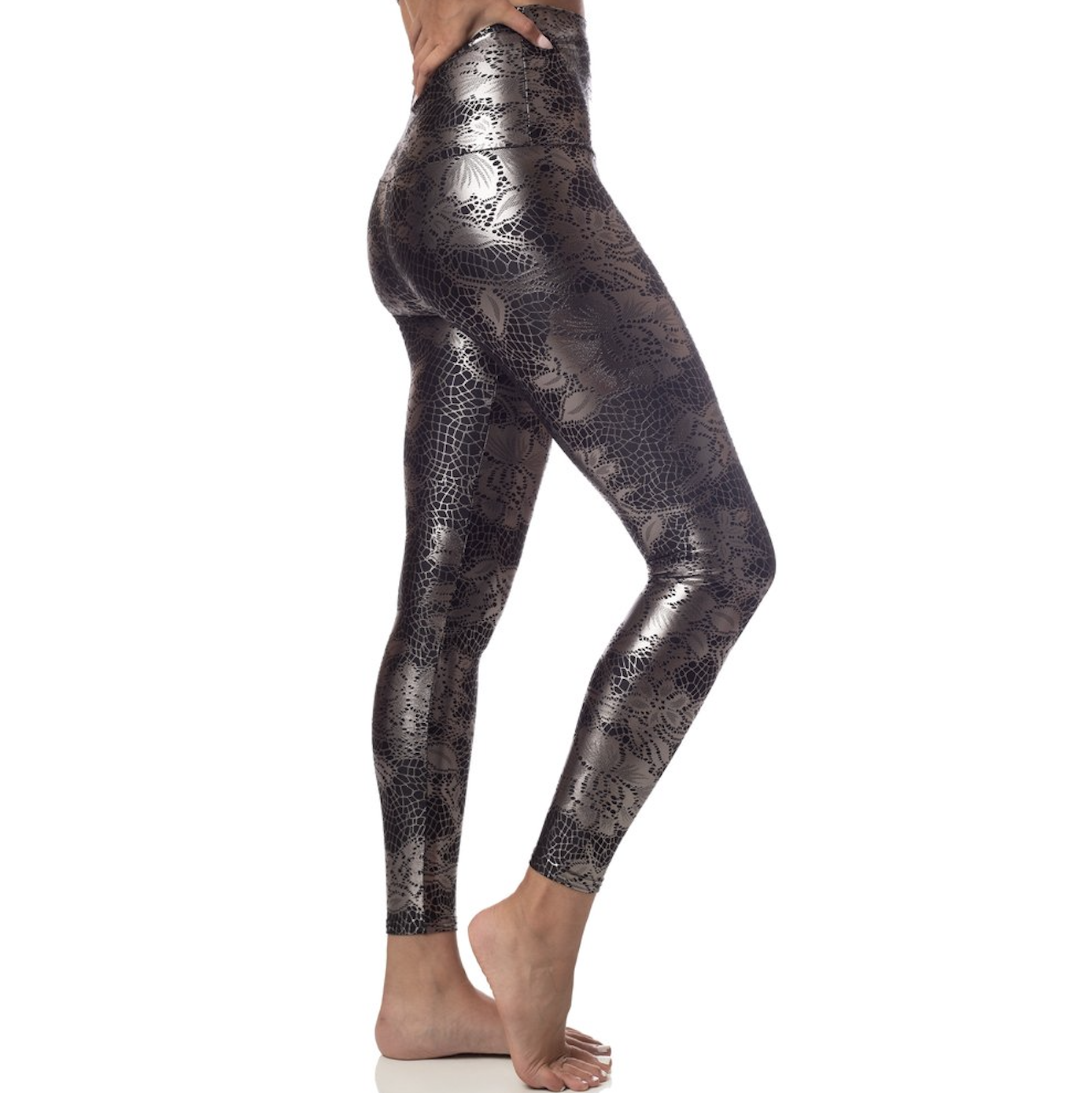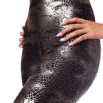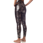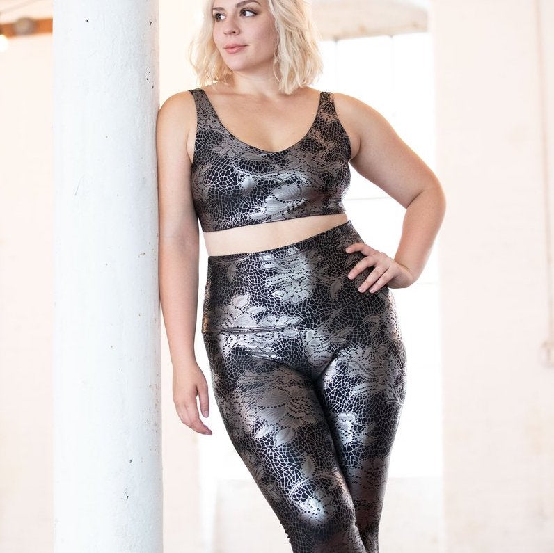 Look and like a sparkly goddess in these high performance, sparkly foil spandex! Perfect for wearing in the studio or a night out. Four-way stretch fabric molds to your body and keeps you cool and dry, with moisture-wicking abilities to take care of sweat! Super comfy high-waisted band that can be folded down to suit your body shape.  Now in a sexy, foil print.  Pair it with the Lace Foil Bra for a matching set!