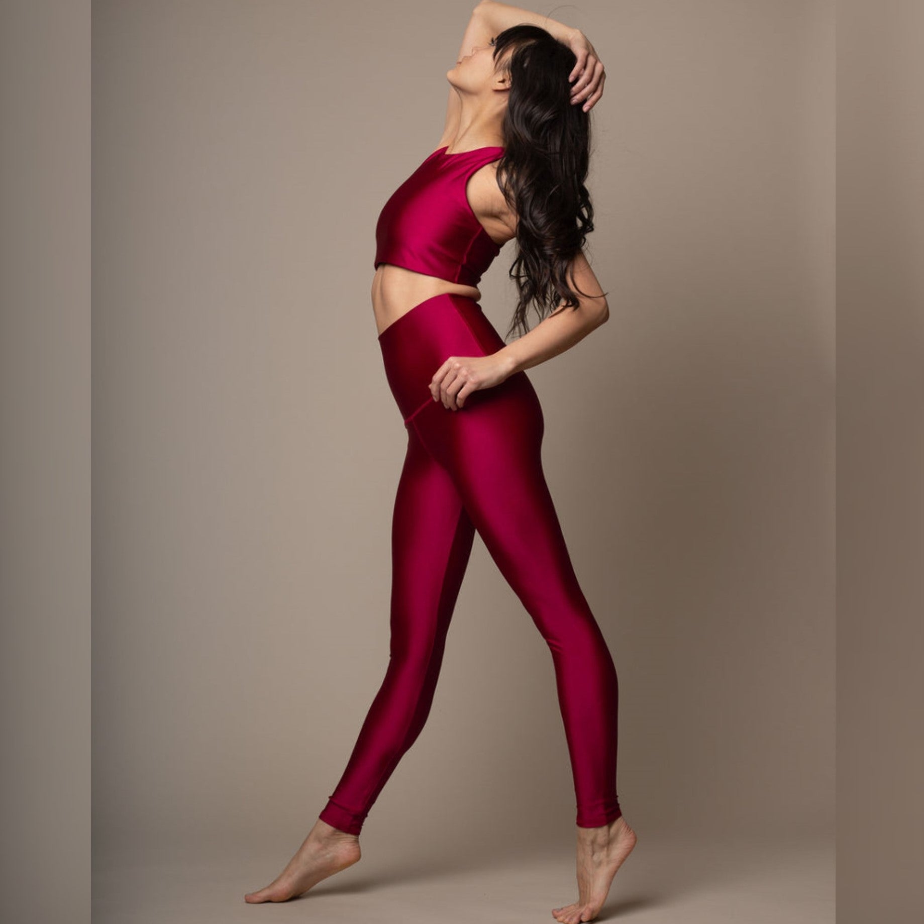 Hello, gorgeous. This stunning legging features a subtle glossy finish in a sophisticated deep cherry hue. The luxe performance fabrication provides the perfect amount of compression and support. Pair it with the matching Cherry crop top to make it a set!