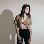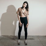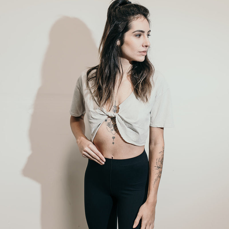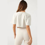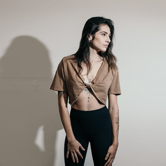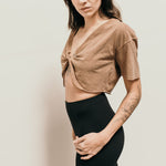 An instant classic! This vintage-inspired tee, features a. twist at the center bust. The cut-off hem and ribbed neckline make for an effortless, sexy style!. Now available in fog cotton and toast cotton!