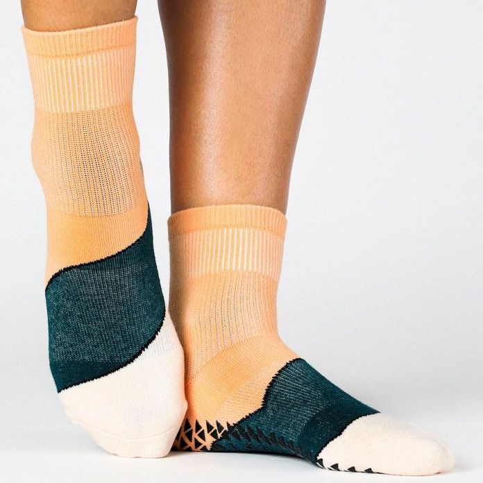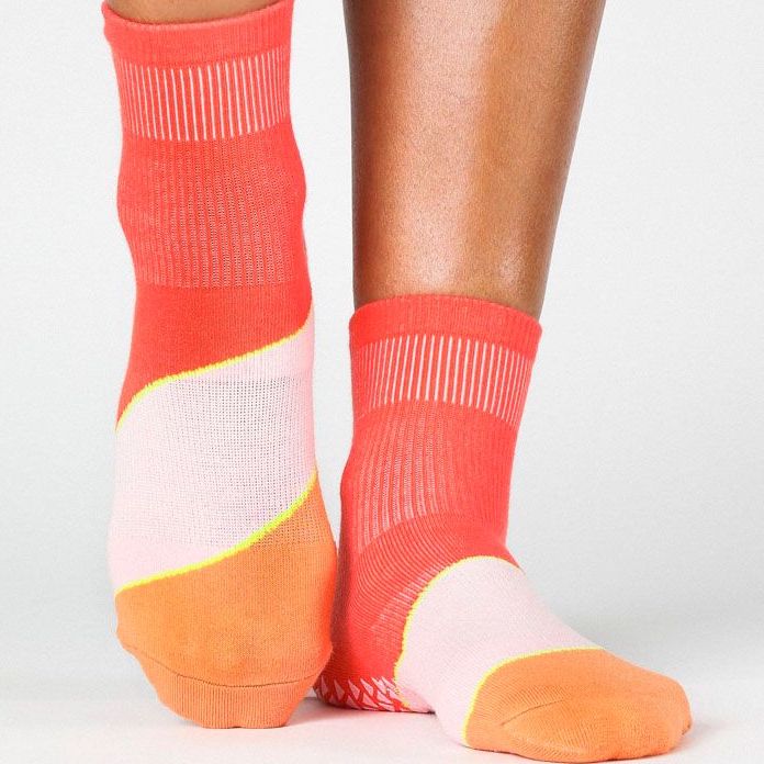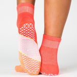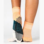 A throwback grip sock that is just the right touch of tomboy. It features Pointe Studio's best-selling original cushioned grip sock making it perfect for barre and pilates. You'll love the higher coverage and nostalgic retro style!  Now in an ankle high crew style with contrast color-block chevron style.