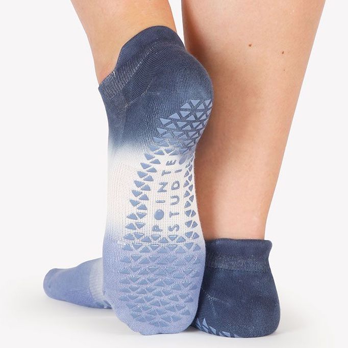 A dip dyed contrast style that features a gorgeous ombre look. Cushioned soles allow for added comfort for your pilates, barre or yoga class. Now available in a white and blue tie-dyed print!
