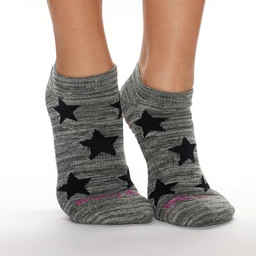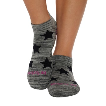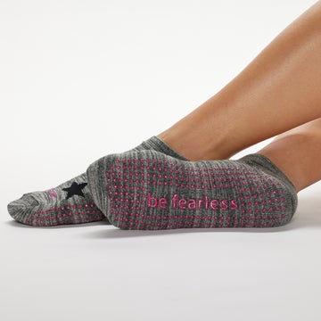 A friendly reminder to dig deep and to Be Fearless. These Mantra grip socks by Sticky Be Socks will pair with your favorite pair of leggings to take your barre, yoga or pilates practice to the next level.  Now in a marbled charcoal color with star print design!
