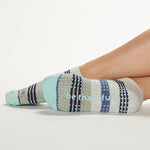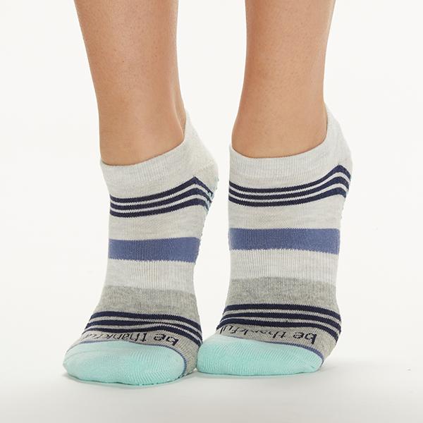 A friendly reminder to be thankful! A classic style grip sock in a vibrant striped print in shades of blue.