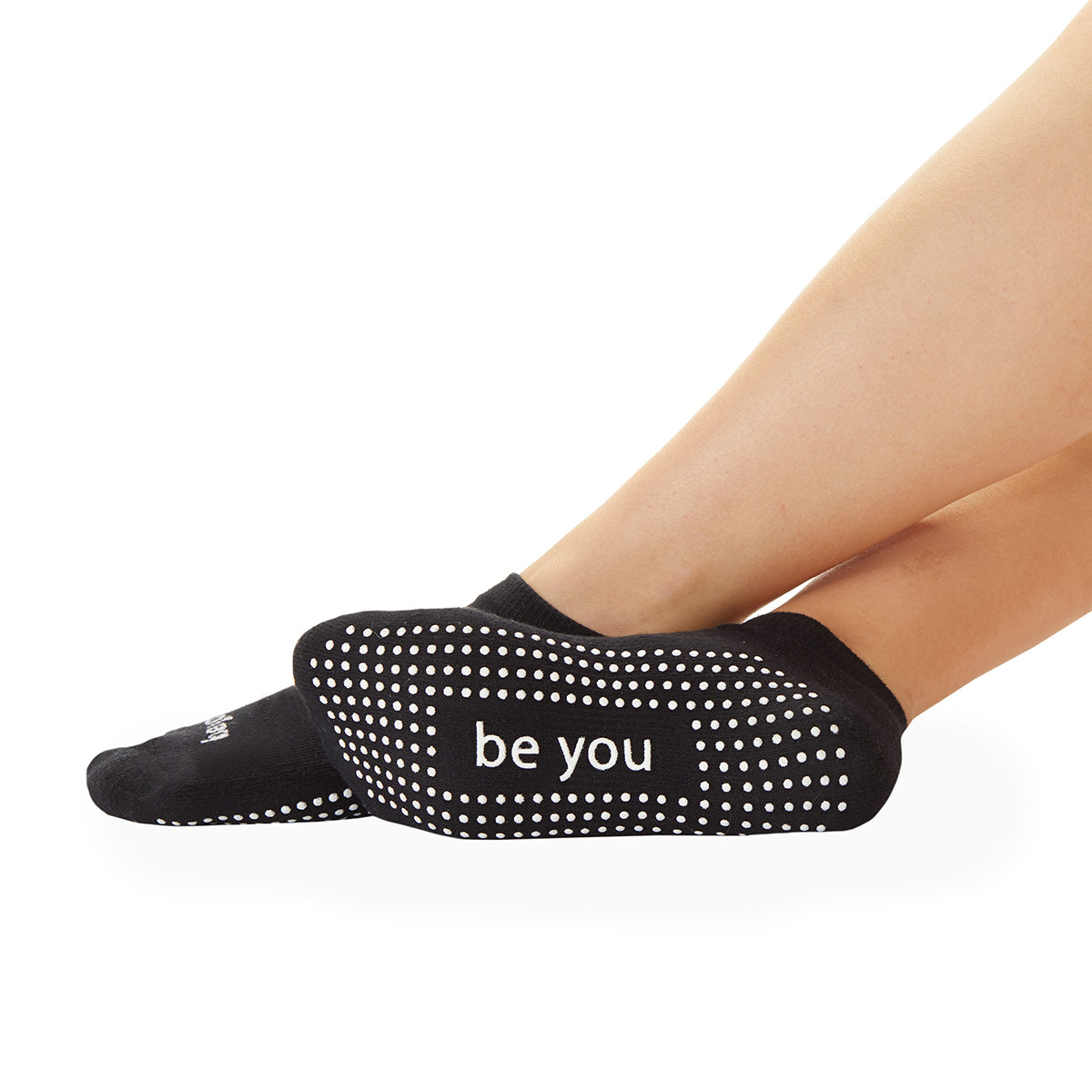 A friendly reminder to be you! Mantra grip socks by Sticky Be Socks pair with your favorite pair of leggings to take your barre, yoga or pilates practice to the next level. Now in a classic black print with white details!